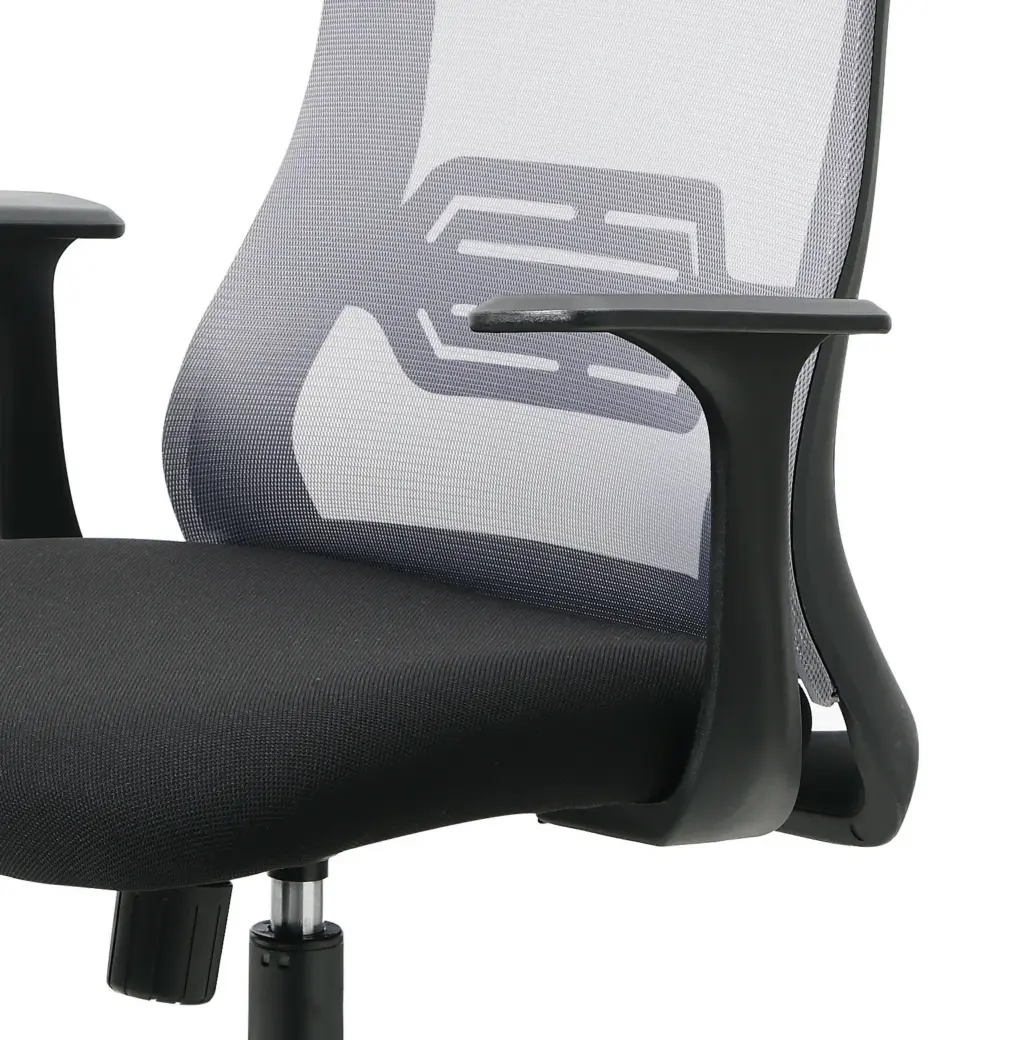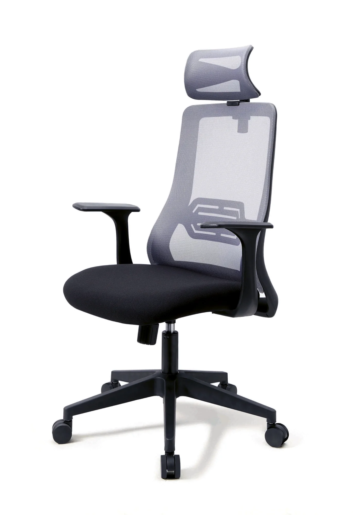 Silla de oficina en gris y negro, diseñada con respaldo transpirable para mayor comodidad. Incluye apoyo lumbar integrado y un cabezal regulable para un soporte óptimo. Cuenta con sistema basculante que permite ajustar la inclinación para adaptarse a las necesidades del usuario. Su estructura y base están fabricadas en nylon inyectado, ofreciendo resistencia y ligereza. Perfecta para un entorno laboral ergonómico y funcional.