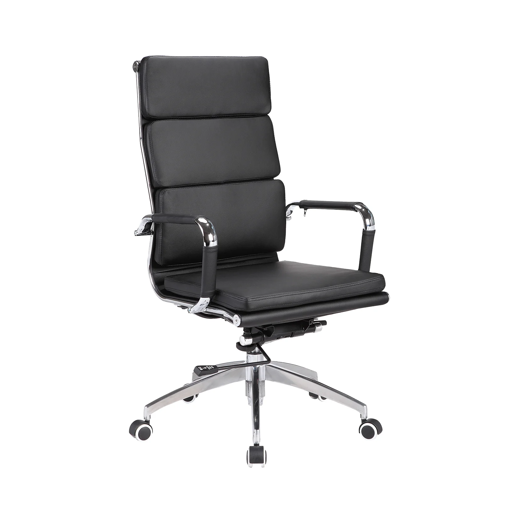 Silla de oficina en polipiel negra con respaldo y asiento acolchados, diseñada para brindar máxima comodidad. Cuenta con sistema basculante para ajustar la inclinación. Su estructura metálica garantiza durabilidad y estabilidad, mientras que las ruedas de silicona permiten un desplazamiento suave y son aptas para todo tipo de suelos. Una opción elegante y funcional para cualquier entorno laboral.