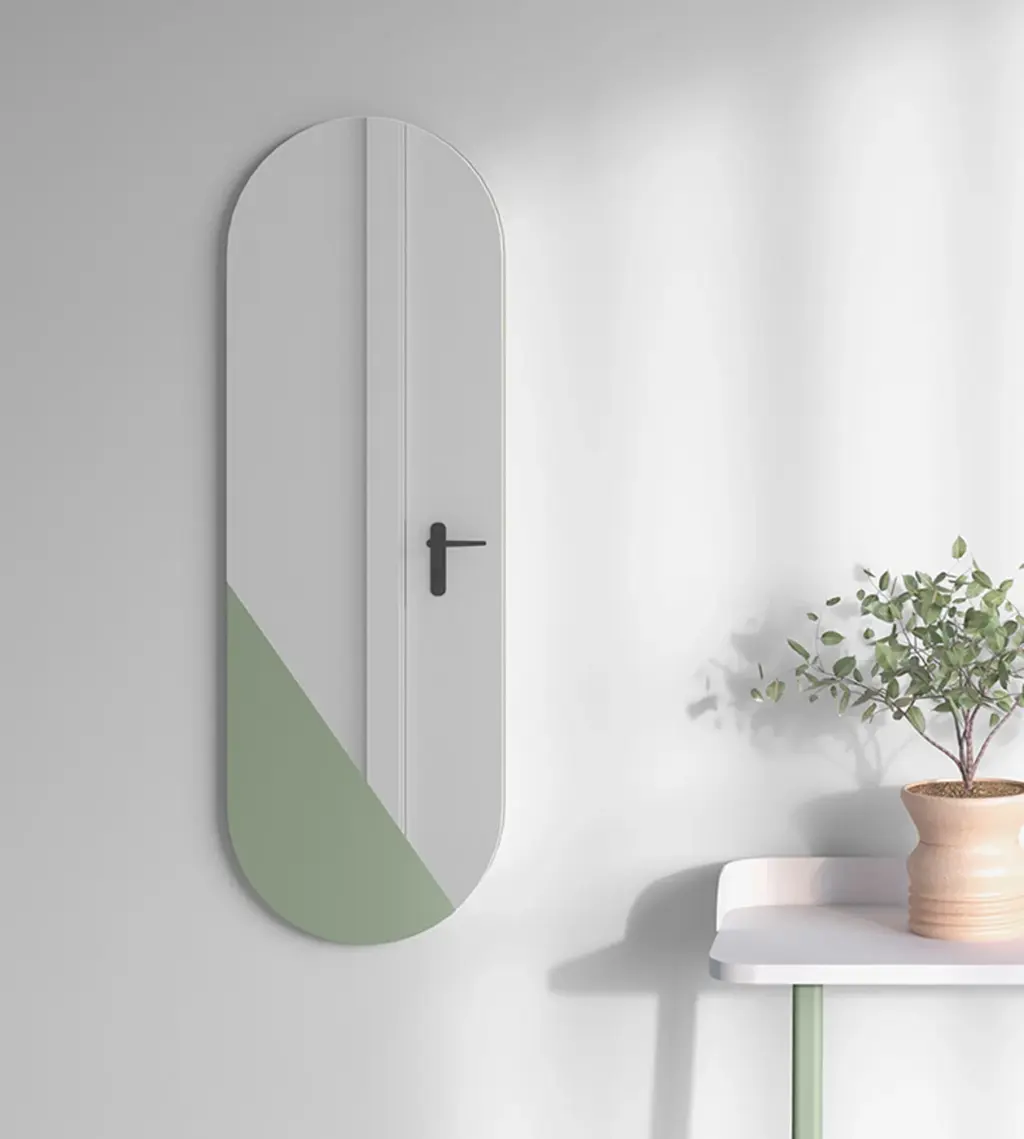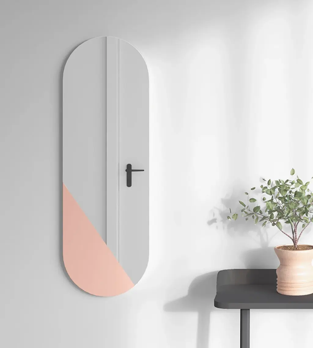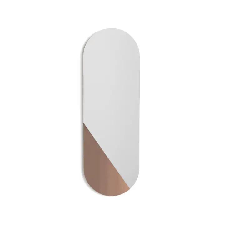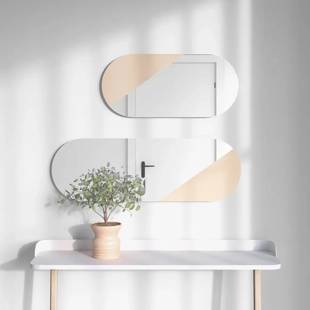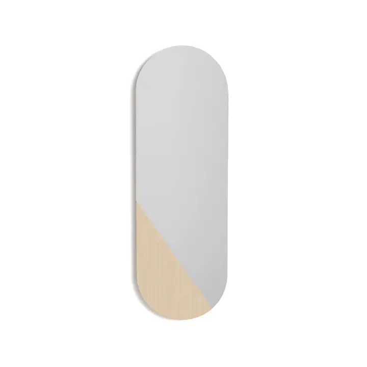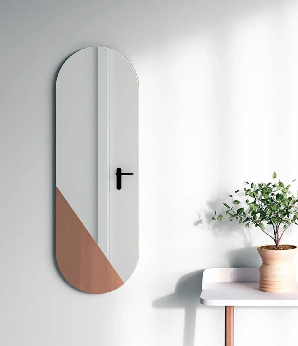 Espejo ovalado sobre trasera de MDF. El diseño cortado del cristal aporta un toque especial, dejando una sección en madera visible, la cual podrás lacar en el color que mejor complemente con tu hogar. Combínalo con el modelo 755, mismo diseño pero un poco más grande.