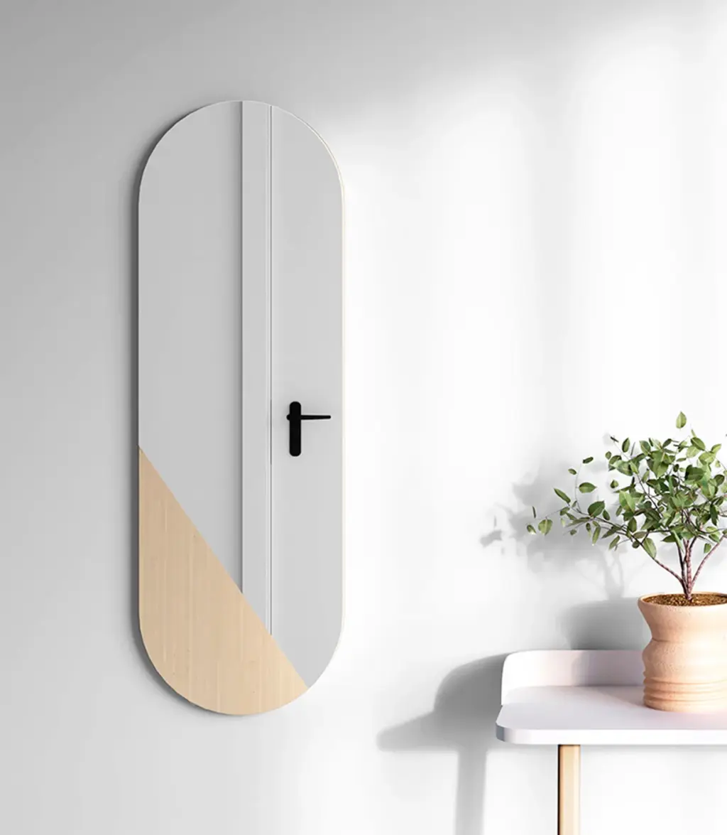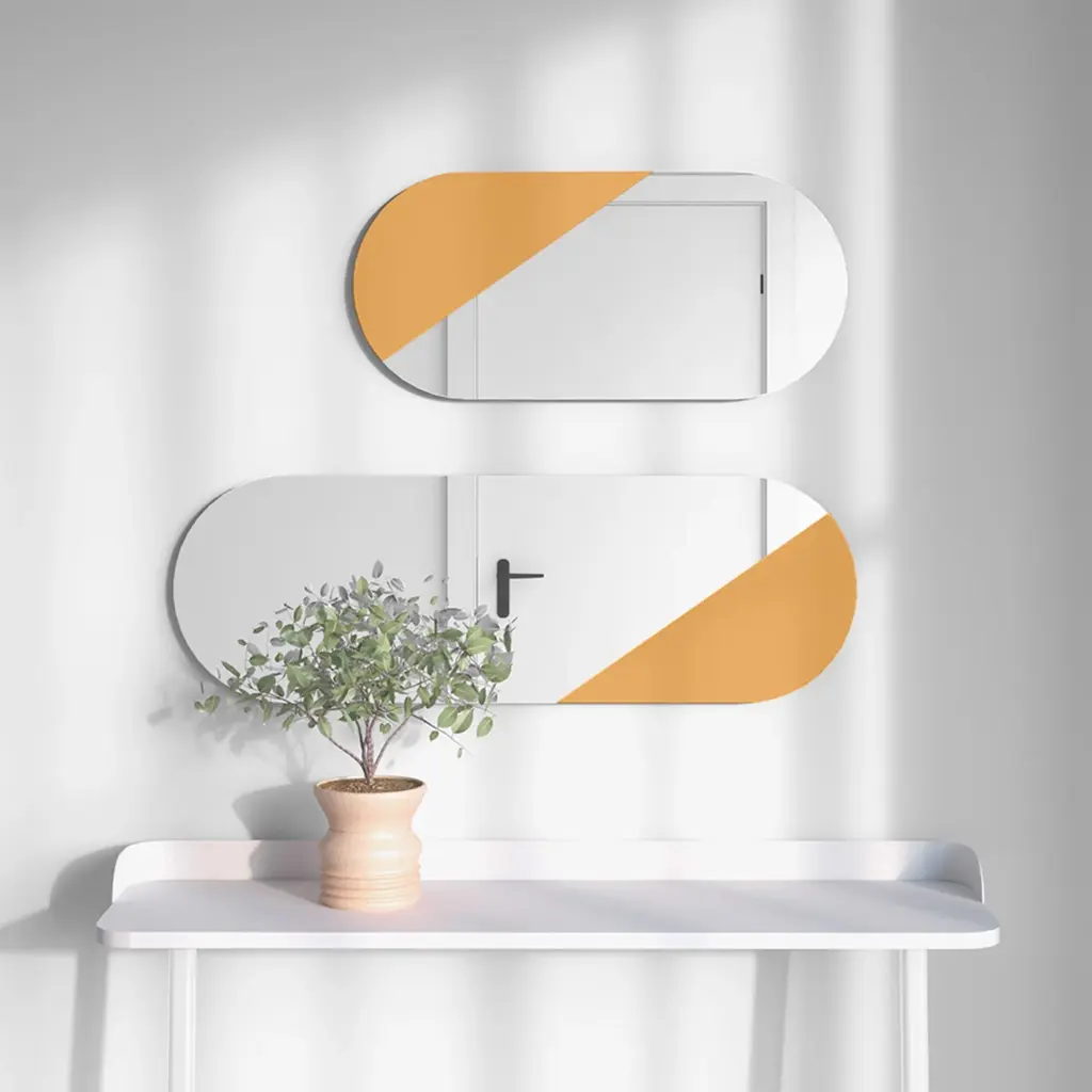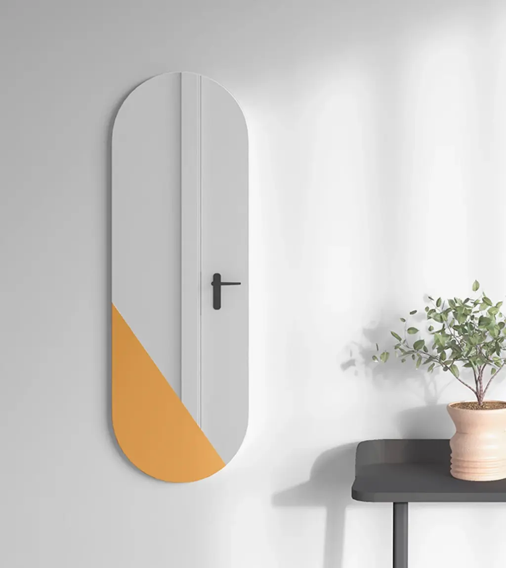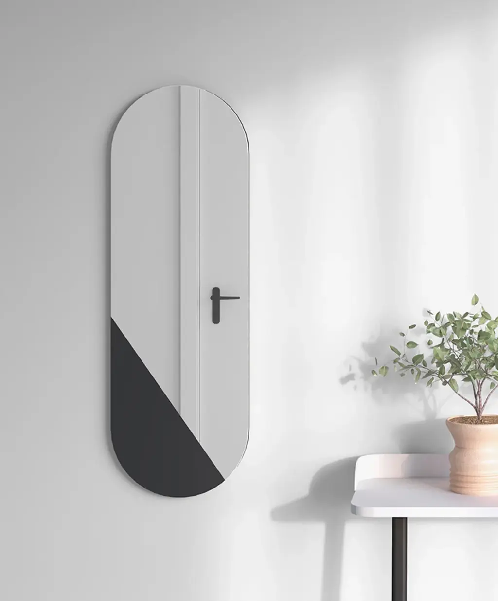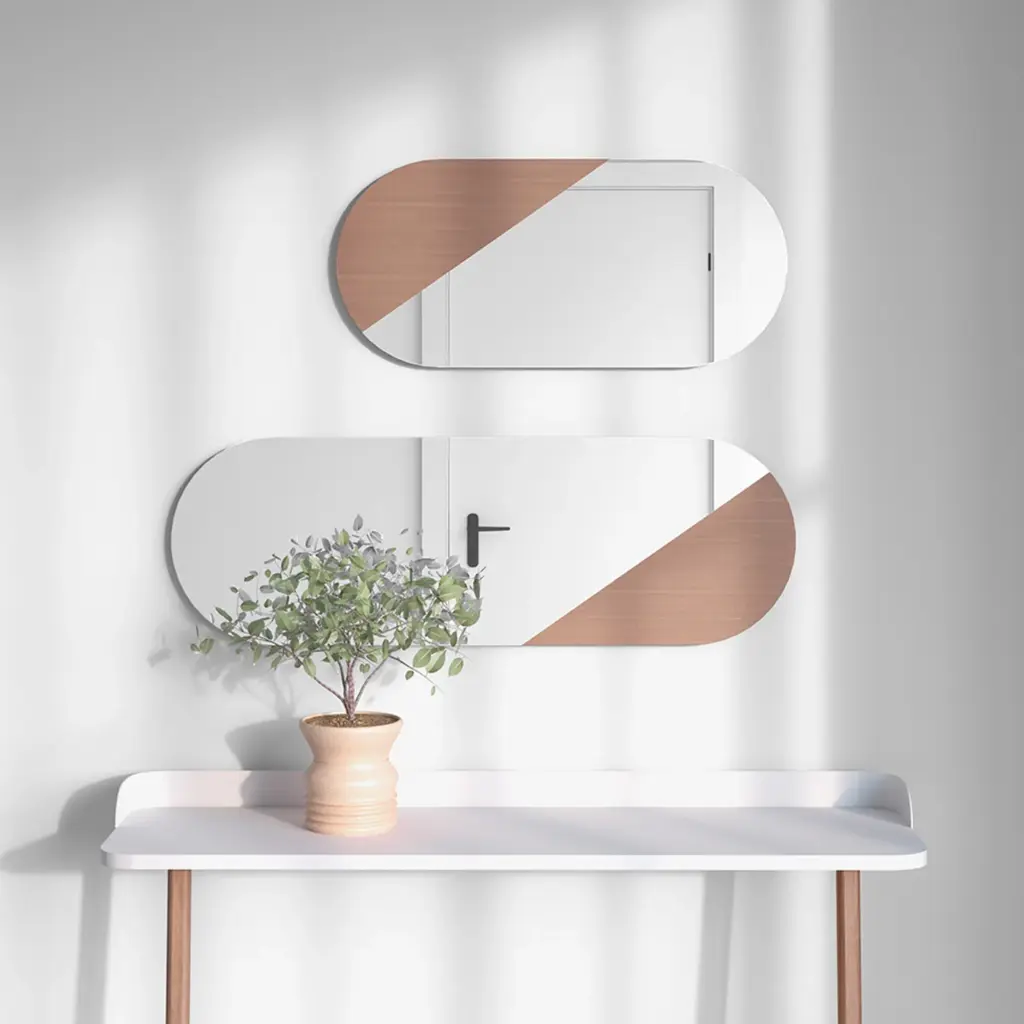 Espejo ovalado sobre trasera de MDF. El diseño cortado del cristal aporta un toque especial, dejando una sección en madera visible, la cual podrás lacar en el color que mejor complemente con tu hogar. Combínalo con el modelo 755, mismo diseño pero un poco más grande.