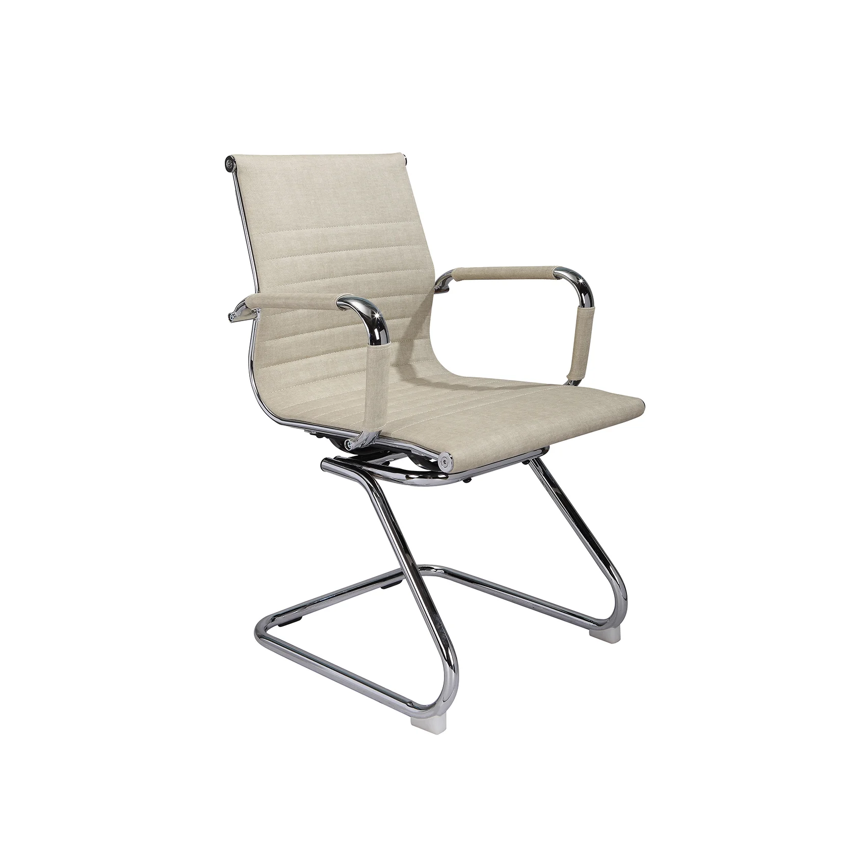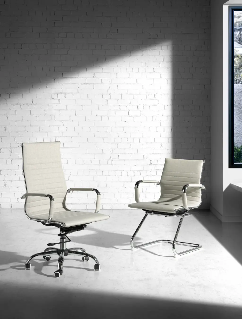 Silla confidente en polipiel beige, con cubrebrazos también en polipiel para mayor comodidad. Su estructura metálica proporciona robustez y estabilidad, mientras que su diseño elegante y sencillo la hace ideal para salas de espera o como silla visitante en despachos.