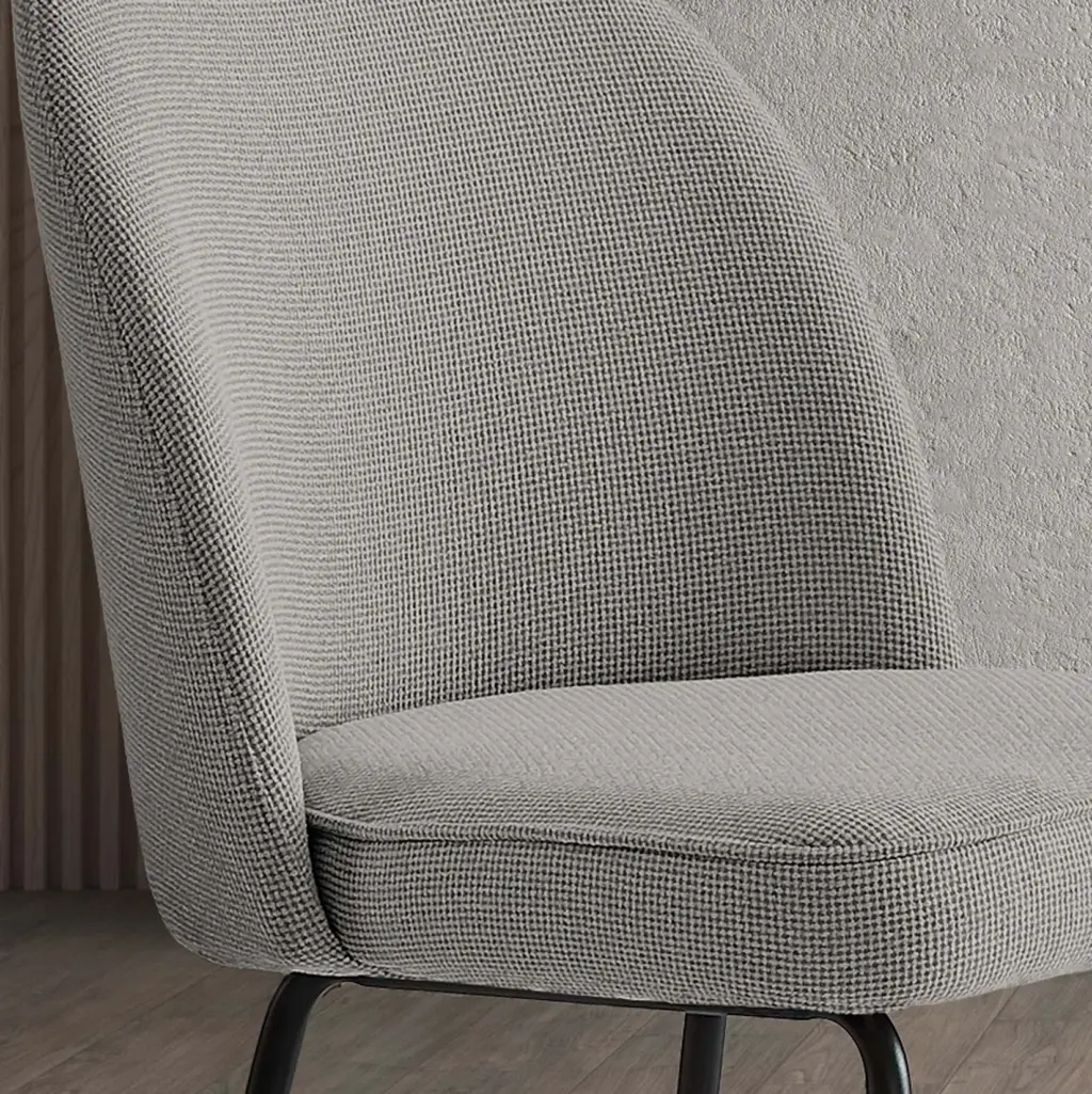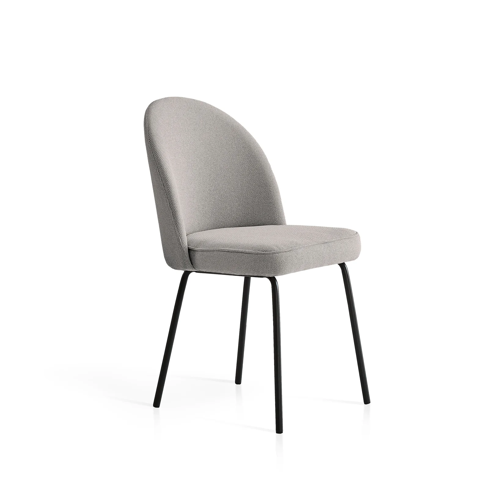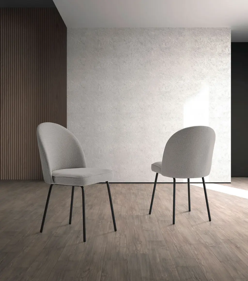 Silla de comedor en textil gris con patas metálicas negras. Diseño minimalista y elegante que aportará un aire distintivo al comedor, el salón o incluso oficinas y sales comunes. Se sirve en set de 2 unidades.