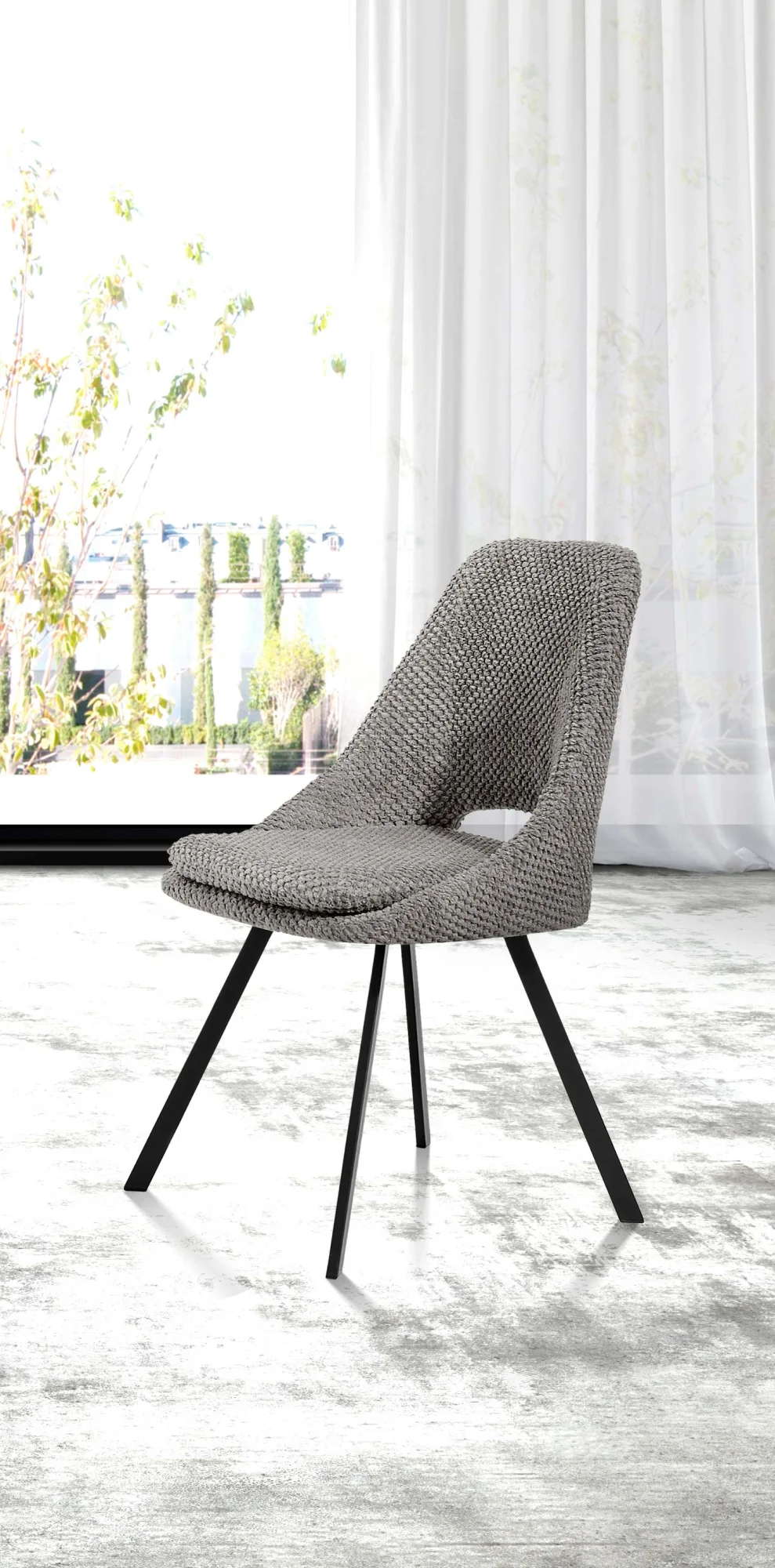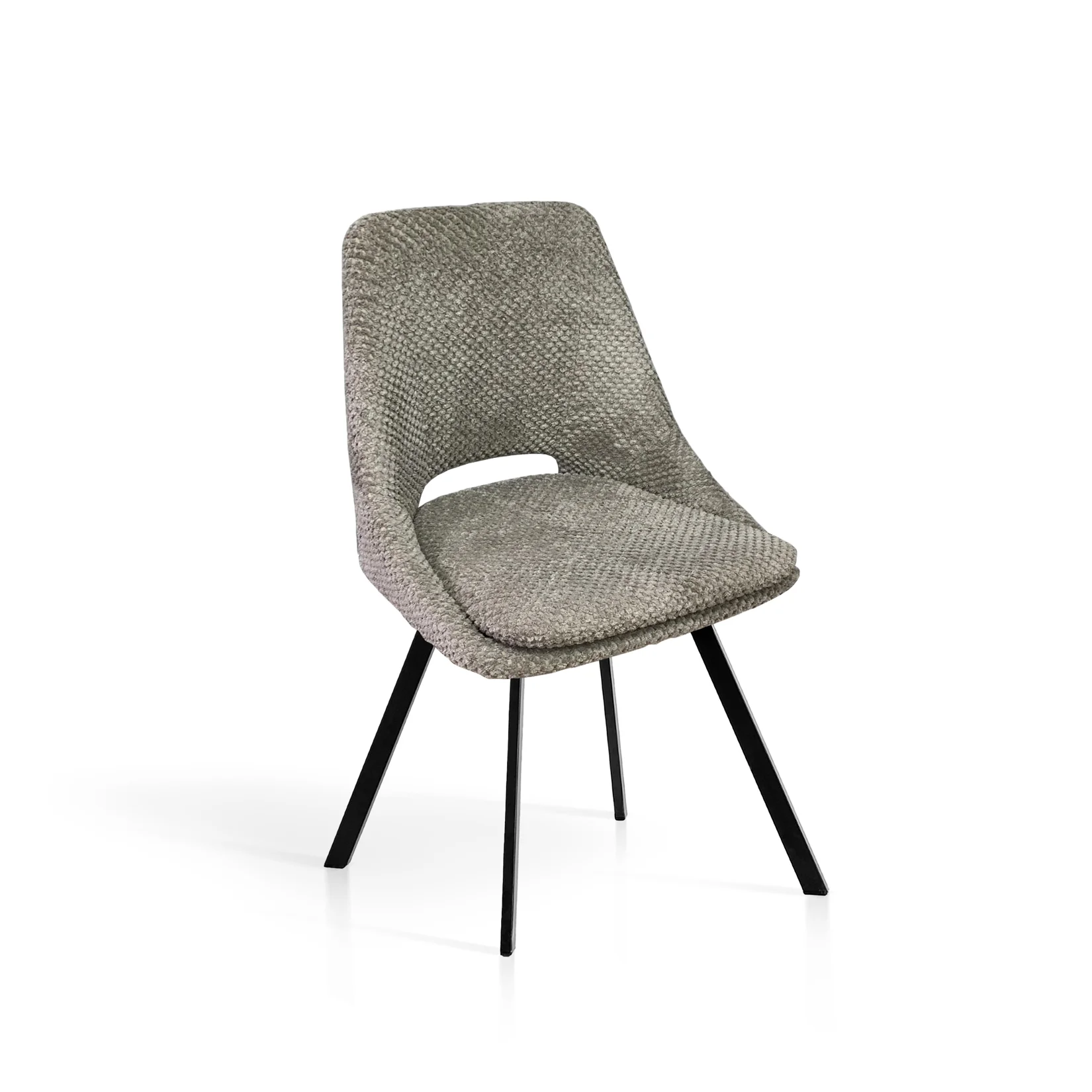 Este modelo de silla en tono gris arena combina un diseño contemporáneo con materiales de alta calidad. Su tapizado de textura acogedora y sus patas metálicas en negro aportan estabilidad y un aire sofisticado, ideal para cualquier comedor o espacio moderno. Se sirve en set de 2 unidades.