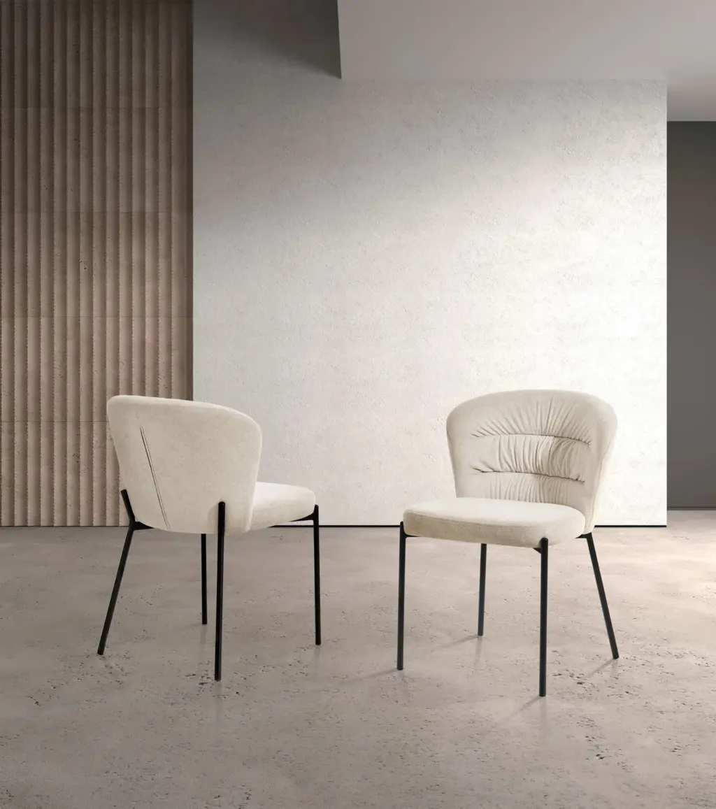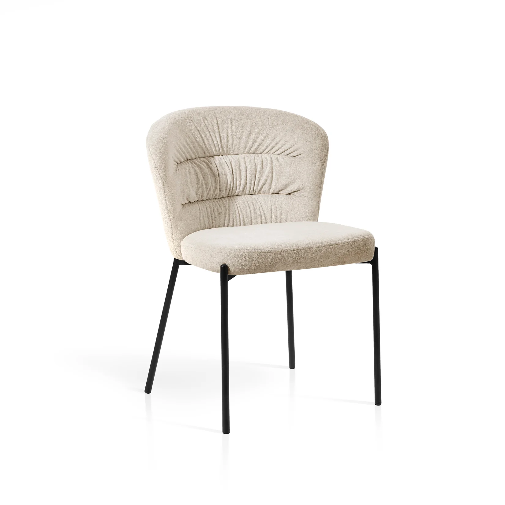 Silla acolchada de diseño moderno, con un respaldo fruncido que aporta un toque atractivo. Tapizada en un suave tono beige, combina a la perfección con sus patas metálicas negras, que le otorgan estabilidad y un contraste sofisticado. Ideal para comedores, oficinas o espacios de reunión, ofreciendo comodidad y estilo en cualquier ambiente. Se sirve en set de 4 unidades.