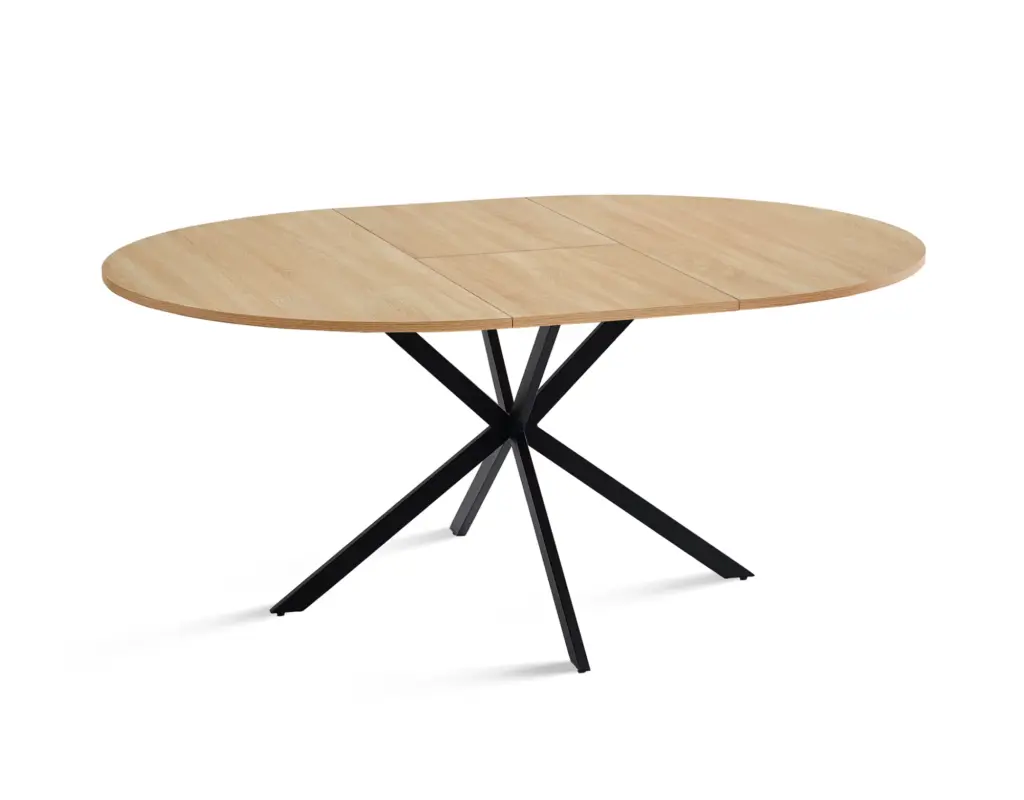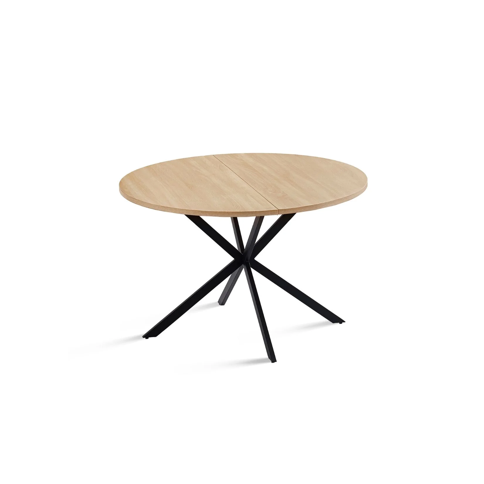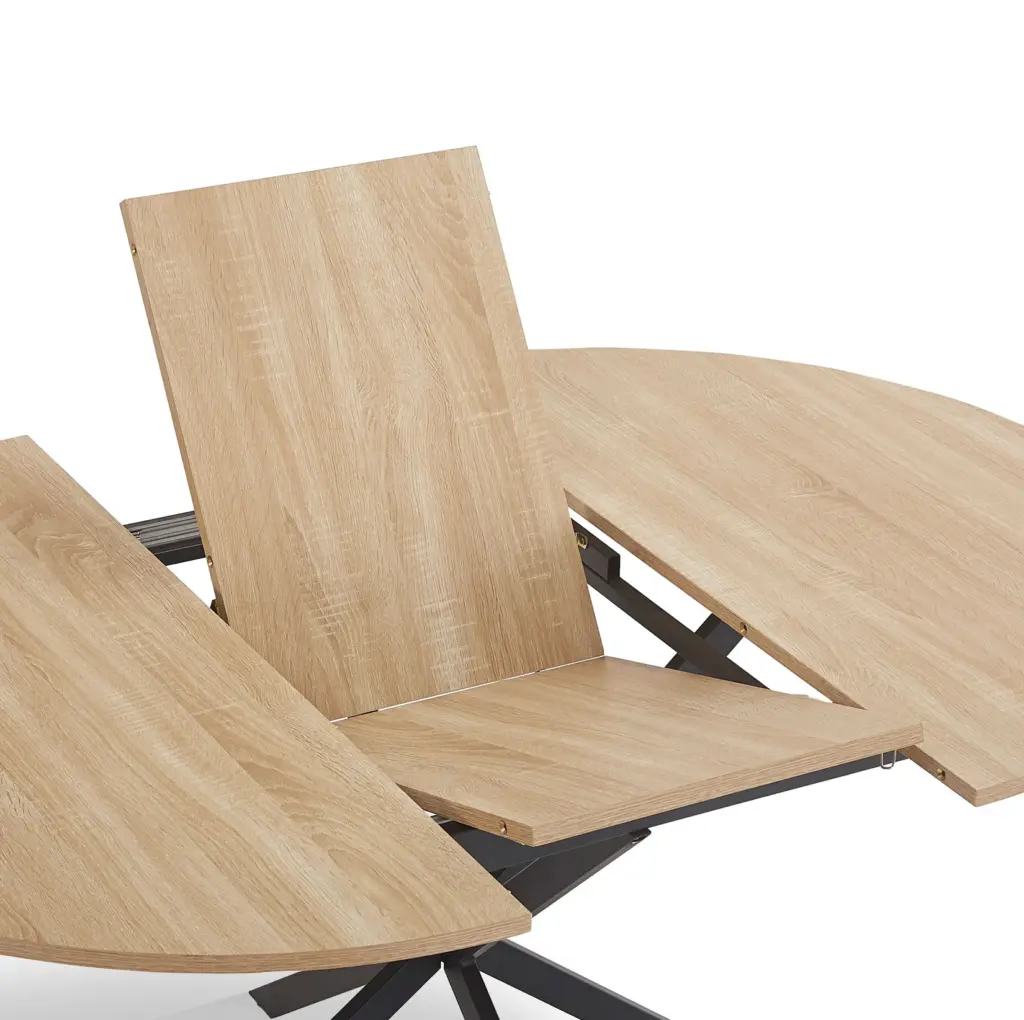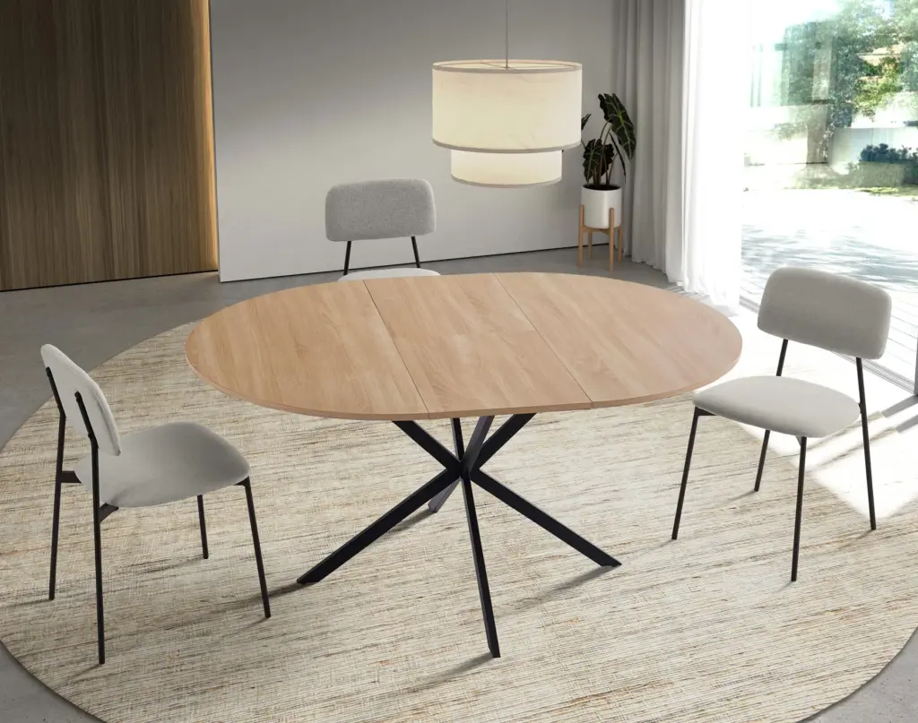 Mesa de comedor redonda extensible, ideal para adaptarse a diferentes necesidades y espacios. Su tapa con acabado en roble aporta calidez y elegancia, mientras que sus patas metálicas negras, dispuestas en ángulo, crean una estructura moderna y visualmente atractiva. Un equilibrio perfecto entre funcionalidad y estilo para cualquier ambiente.