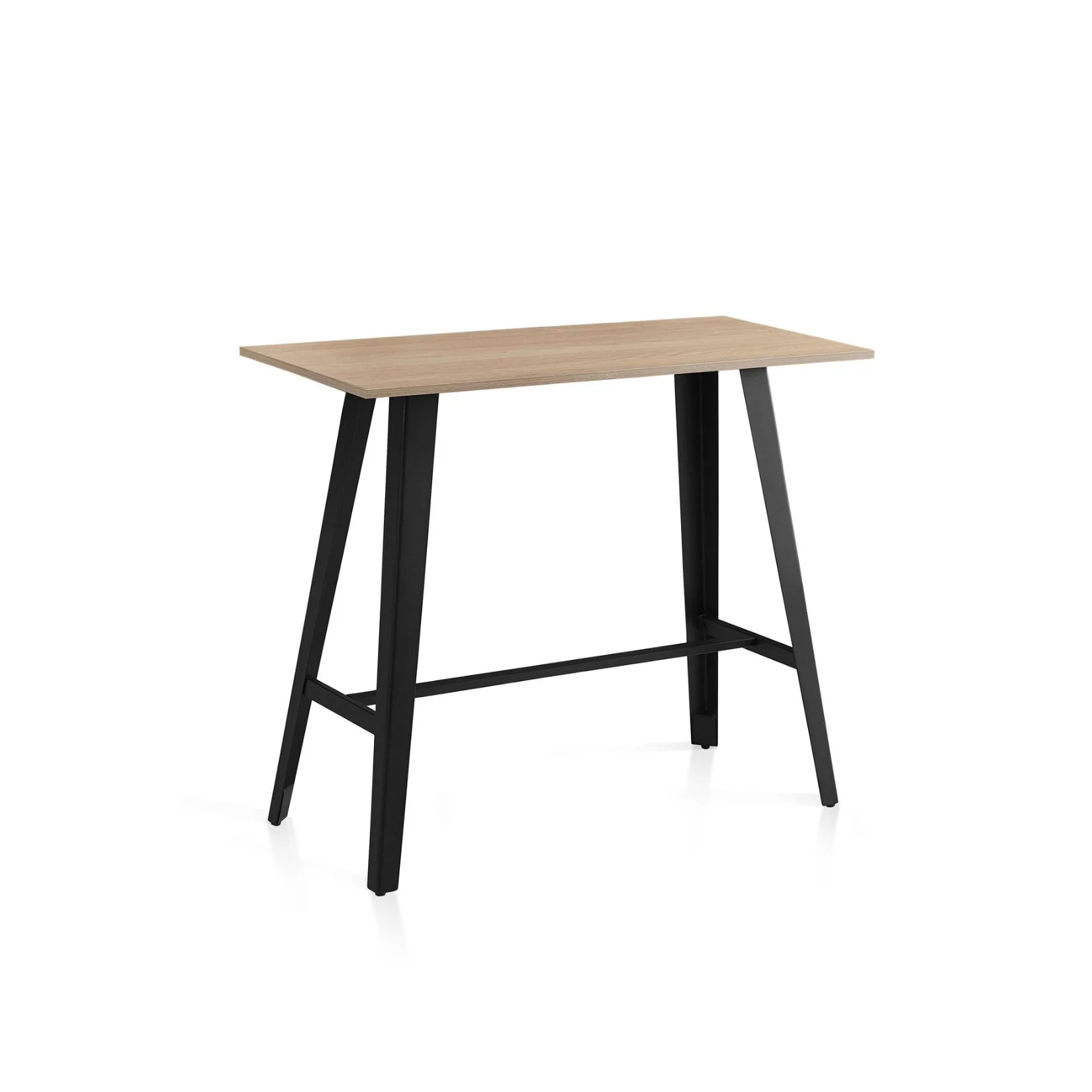 Mesa alta de diseño moderno, ideal para espacios de comedor, cocina o zonas de bar. Su tapa con acabado en roble aporta un toque cálido y natural, mientras que su base de patas metálicas negras en forma de ángulo garantiza estabilidad y resistencia.