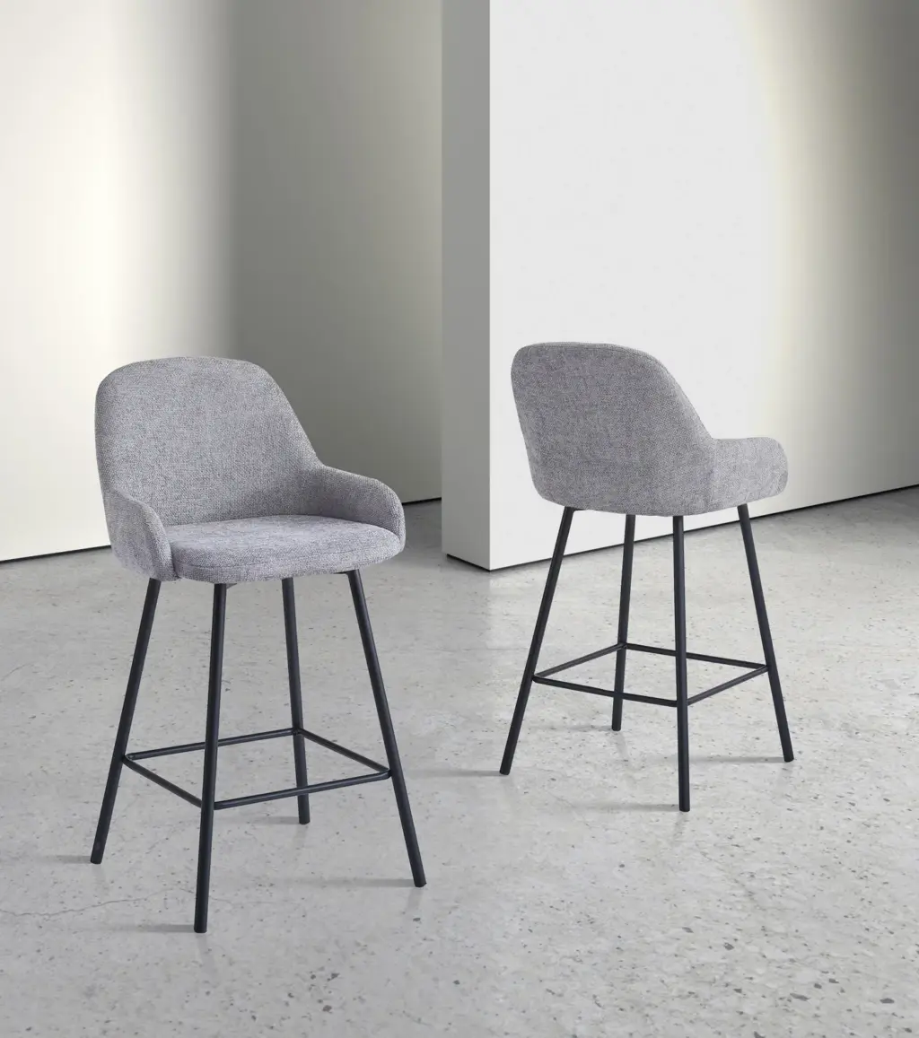 Taburete alto con asiento acolchado tapizado en tela gris de tacto agradable y fácil mantenimiento. Su estructura cuenta con patas metálicas negras, aportando estabilidad y un diseño moderno que se adapta a distintos estilos de decoración. Perfecto para barras de cocina, islas o espacios de hostelería, combinando funcionalidad y elegancia. Se sirve en set de 2 unidades.