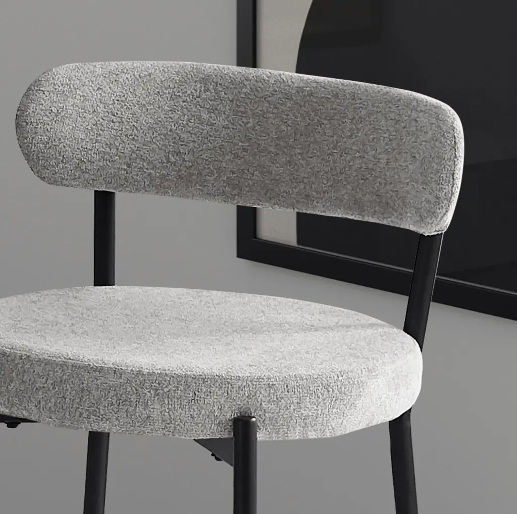Taburete alto de diseño redondo con asiento acolchado, tapizado en tela gris suave y resistente. Su estructura cuenta con patas metálicas negras, ofreciendo estabilidad y un estilo moderno. Ideal para barras de cocina, islas o espacios de hostelería, combinando comodidad y sofisticación. Se sirve en set de 2 unidades.