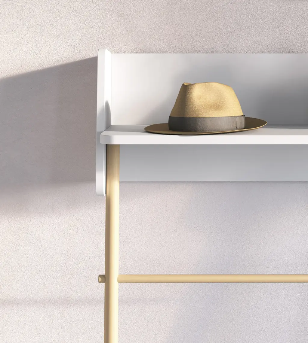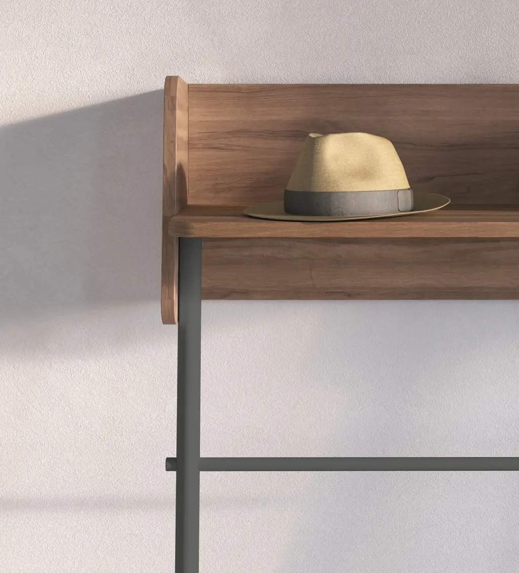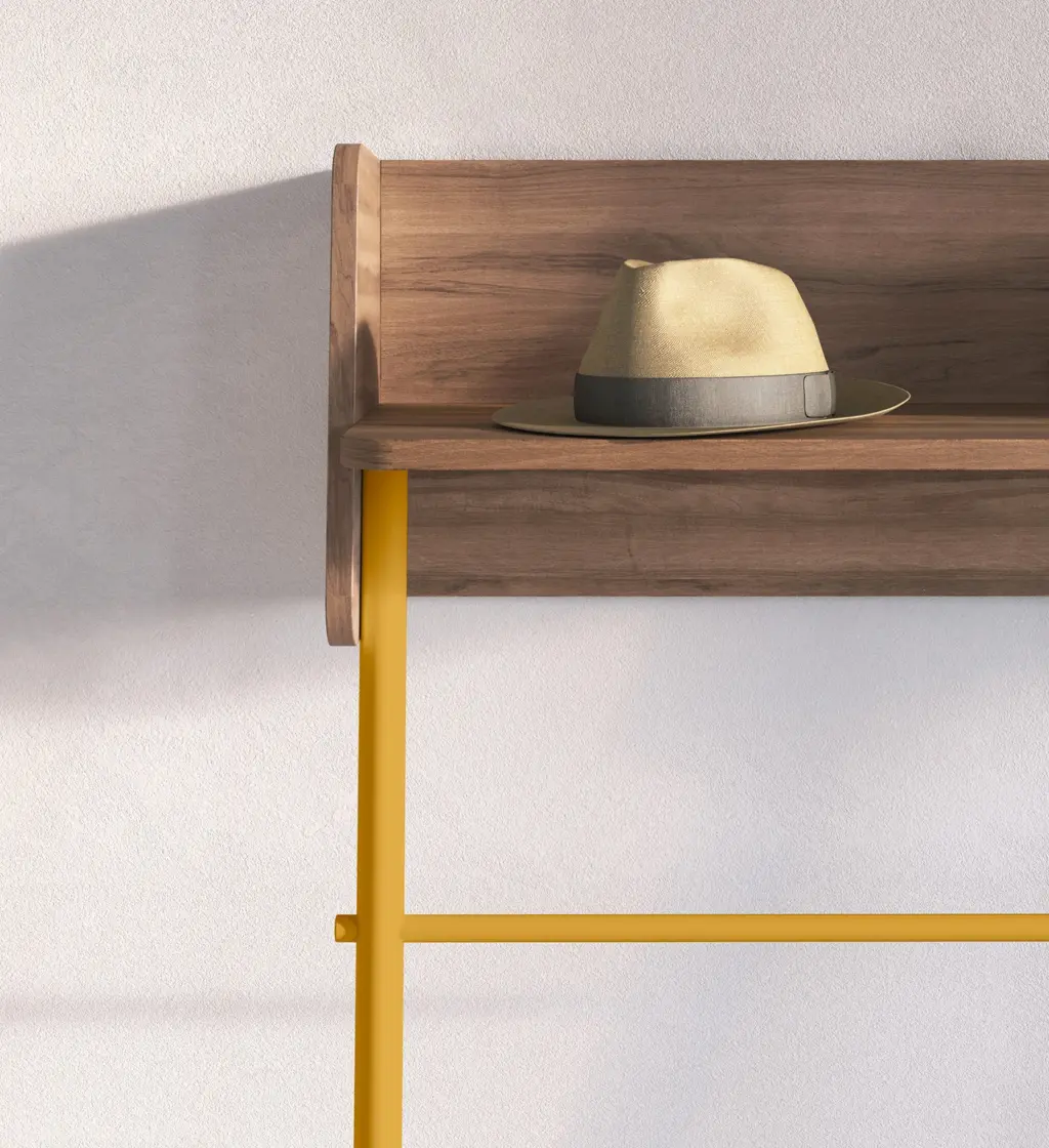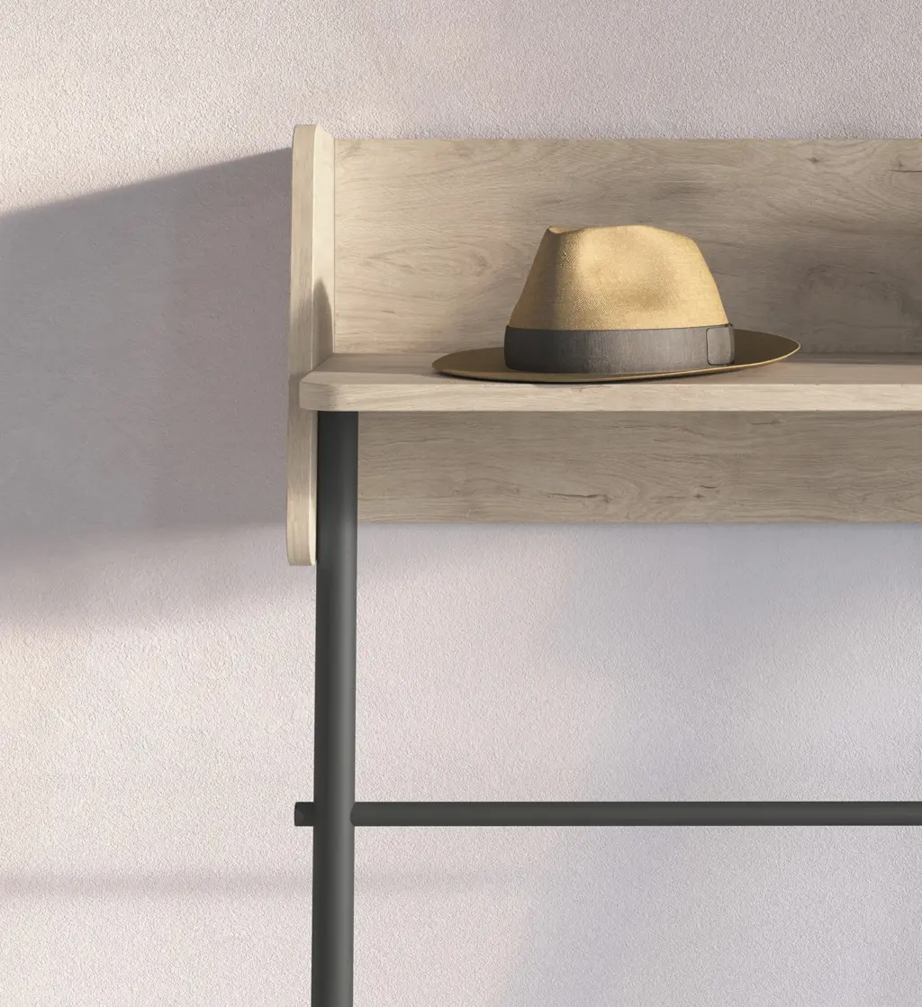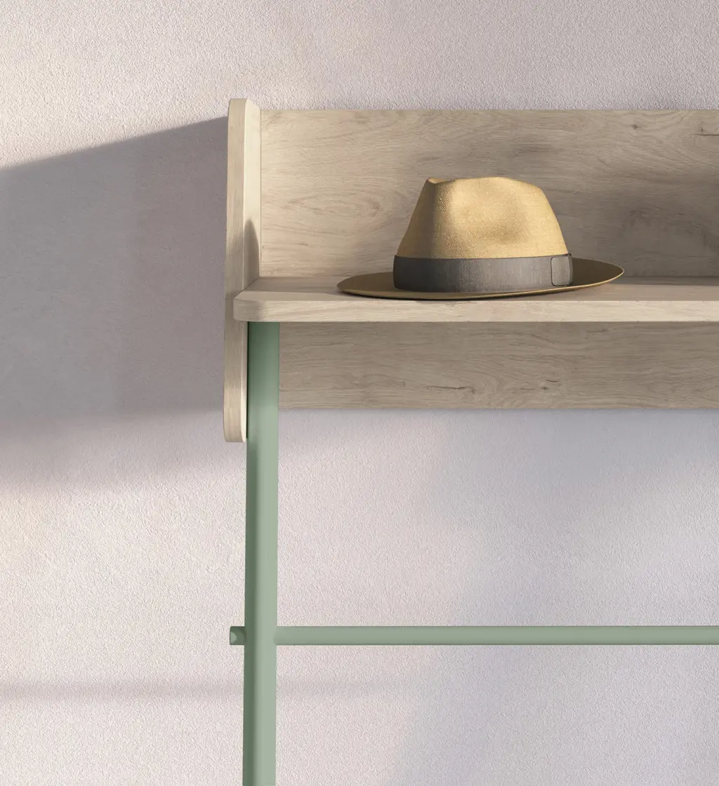 Consola fabricada en melamina y madera de haya en un estilo minimalista. Diseño sencillo con sistema de anclaje a la pared, ideal para espacios reducidos. Las múltiples opciones de color disponibles te permitirán adaptar esta pieza al espacio que elijas, proporcionando personalidad y un toque único.