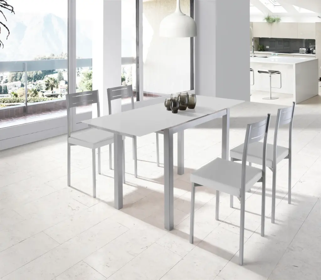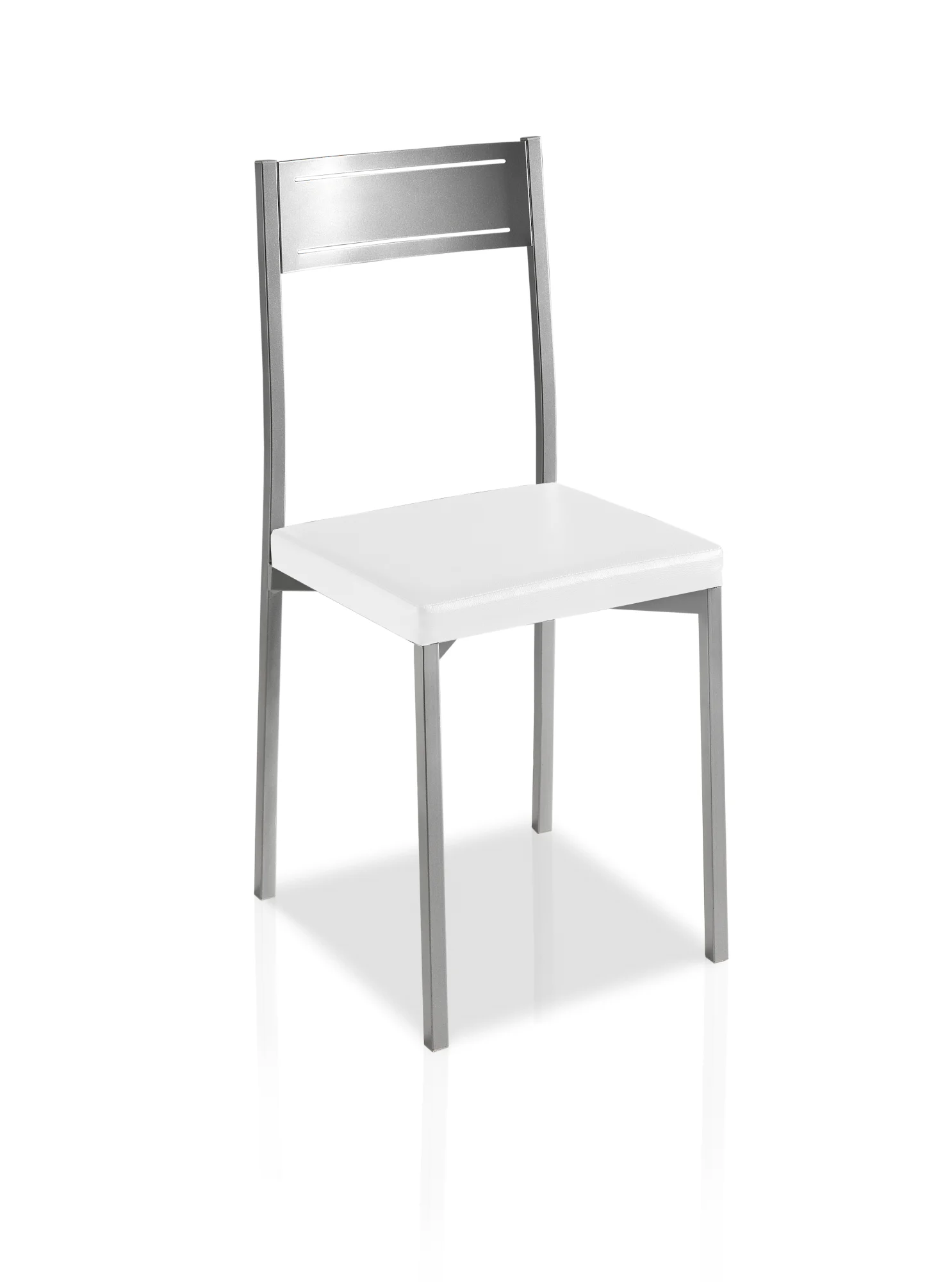 Silla de cocina en líneas cuadradas de estilo minimalista. Cuenta con la estructura metálica gris y el asiento tapizado en polipiel blanca. Pídelas con una de nuestras mesas a juego para crear un espacio acogedor en tu cocina.