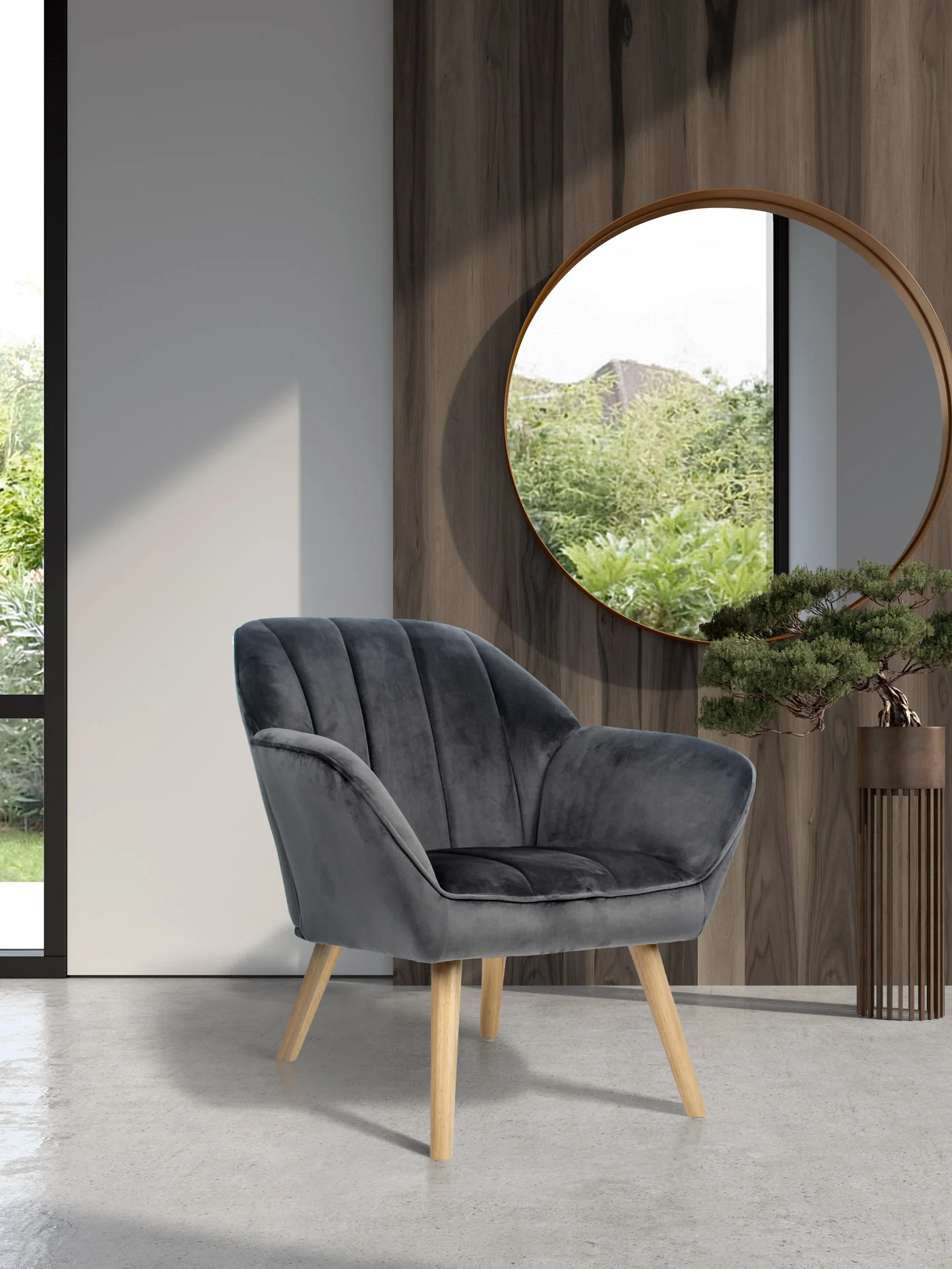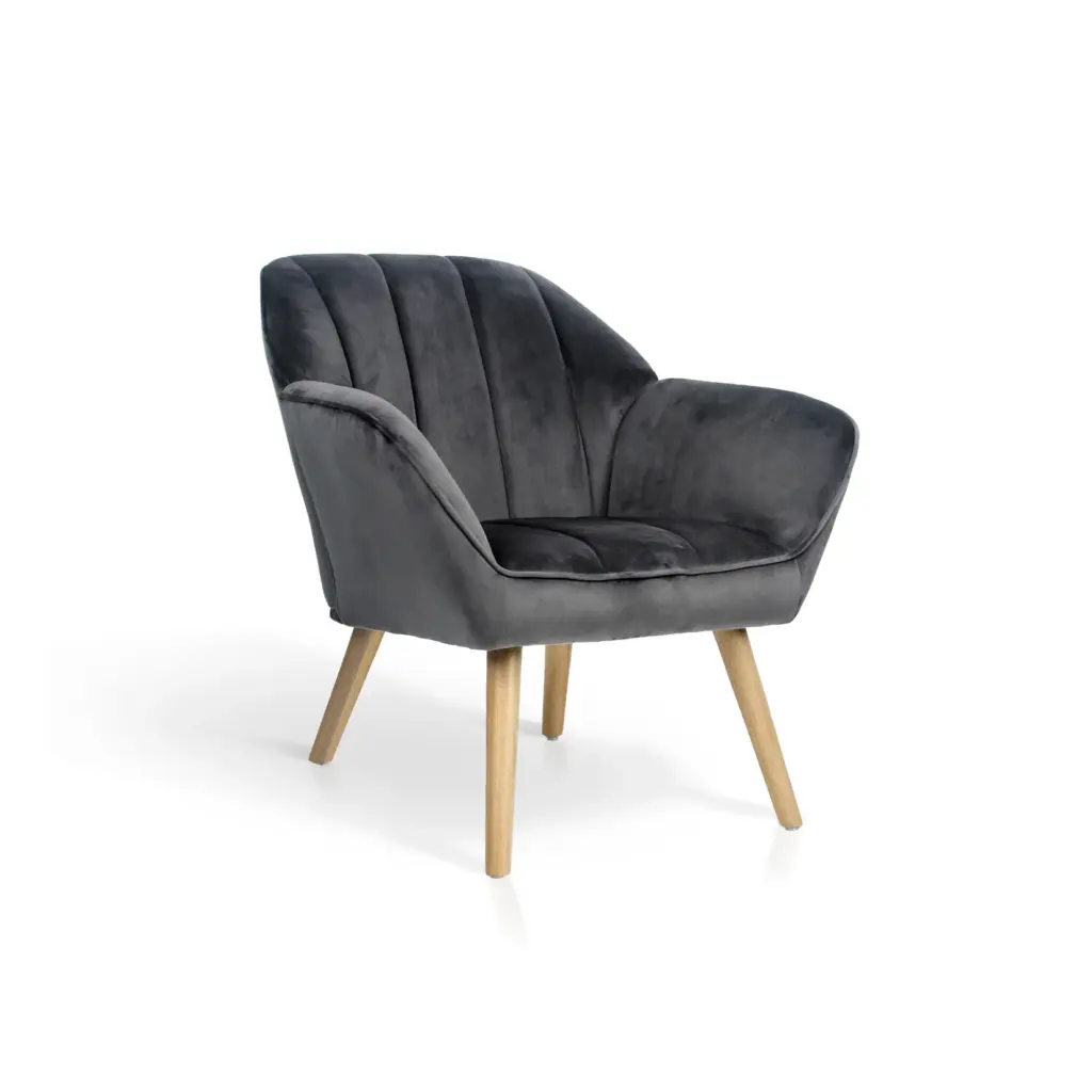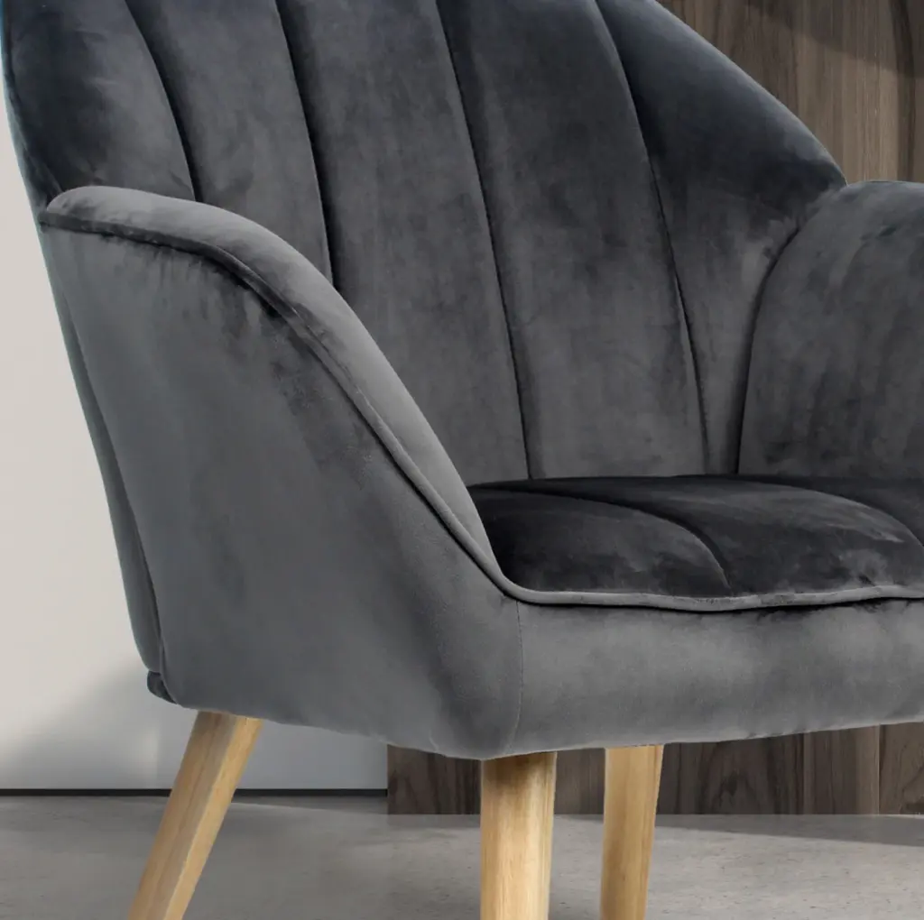 Sillón en terciopelo gris natural con líneas decorativas en respaldo y asiento. Incluye patas de madera natural y respaldo fijo con cremallera trasera. Cómodo, elegante y fácil de montar, ideal para espacios modernos.