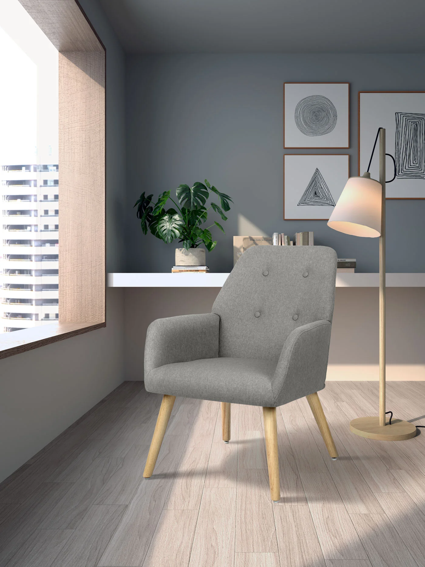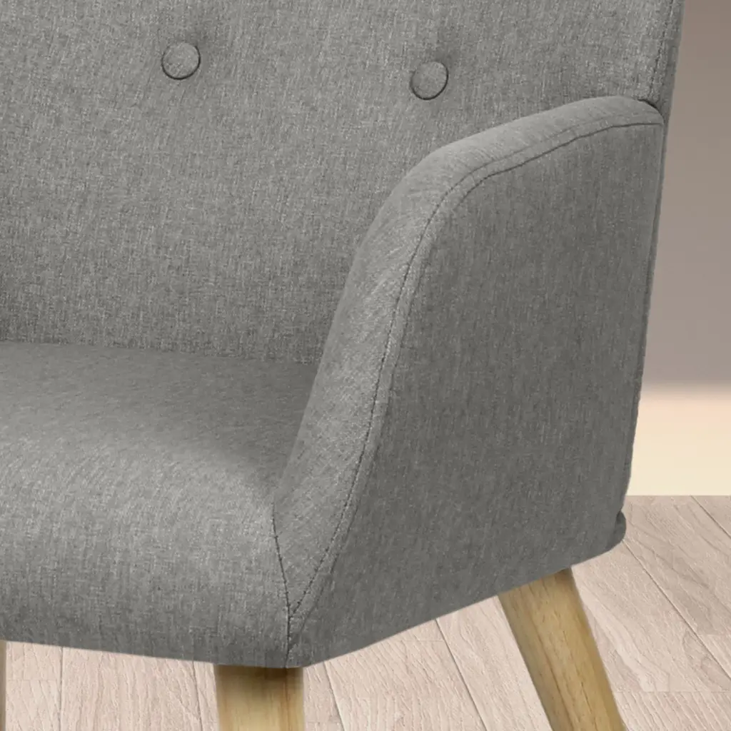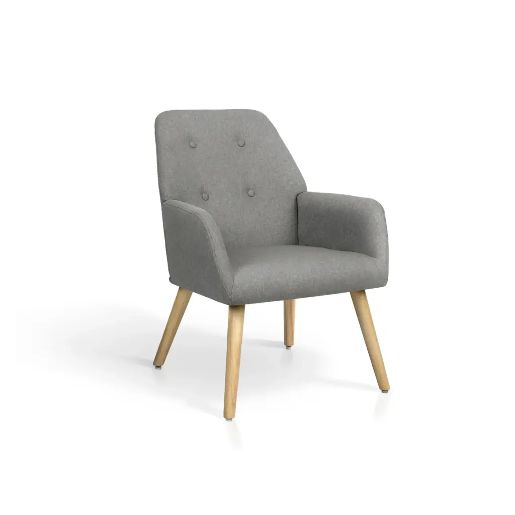Sillón en tela moteada gris natural con respaldo decorado con botones y cremallera trasera. Patas de madera natural y diseño compacto. Cómodo, resistente y fácil de montar, perfecto para cualquier rincón del hogar.