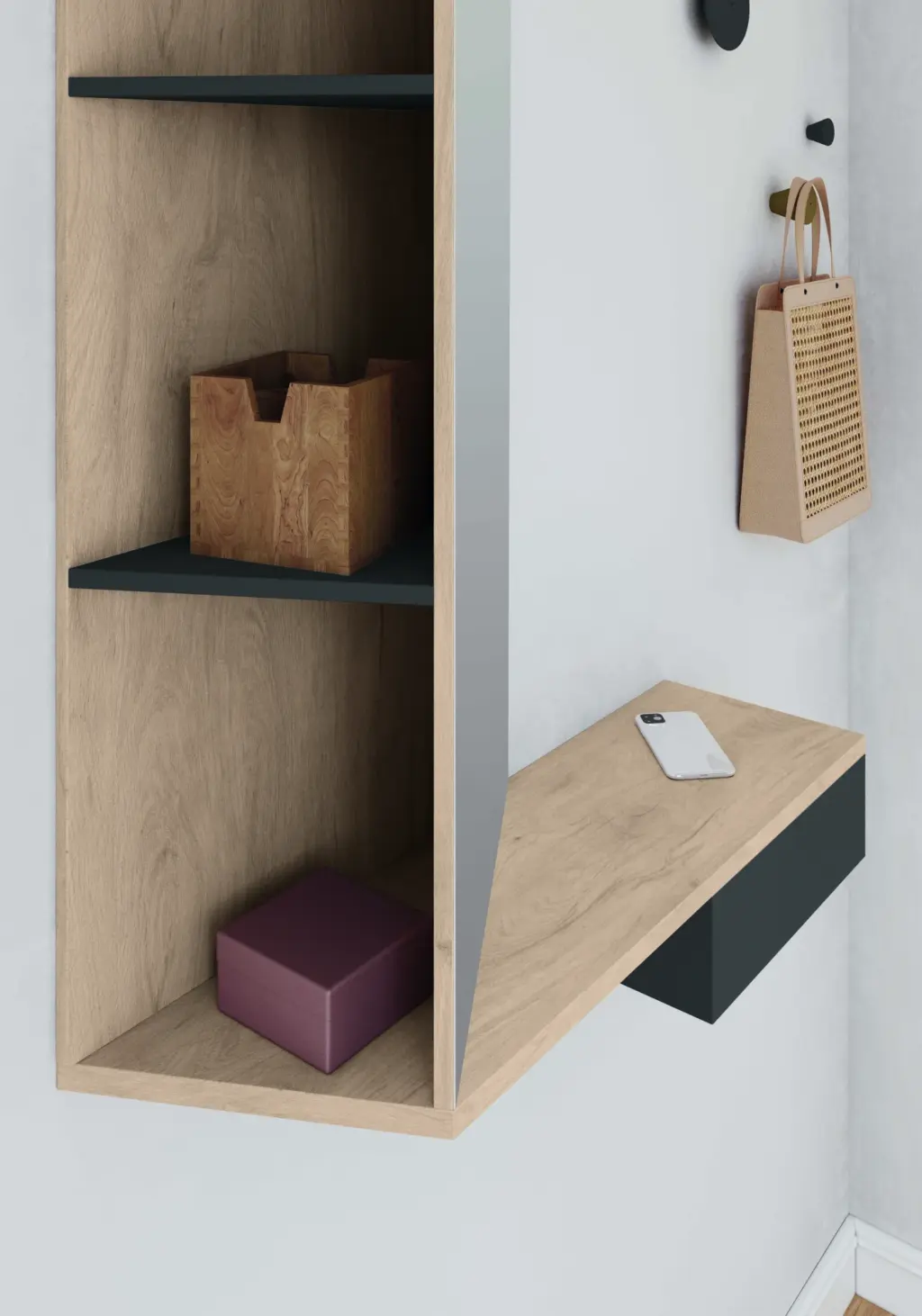 Consola suspendida fabricada en melamina con espejo y cajón. Dispone de 3 compartimentos detrás del espejo, dando la funcionalidad necesaria. El diseño sin patas es ideal para espacios reducidos.